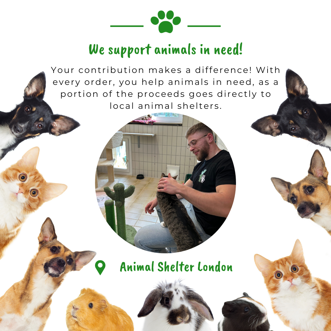 With every order we put a part of it into our donation pot. As soon as a sufficiently large amount has been accumulated, we hand it over to regional animal shelters.